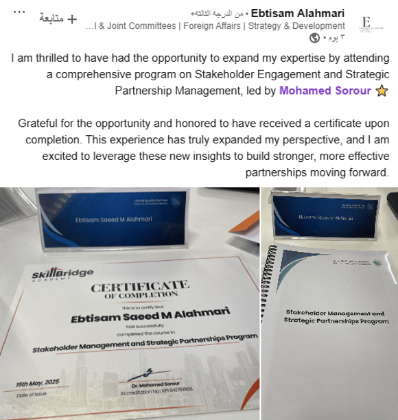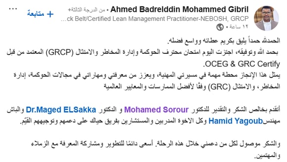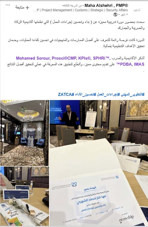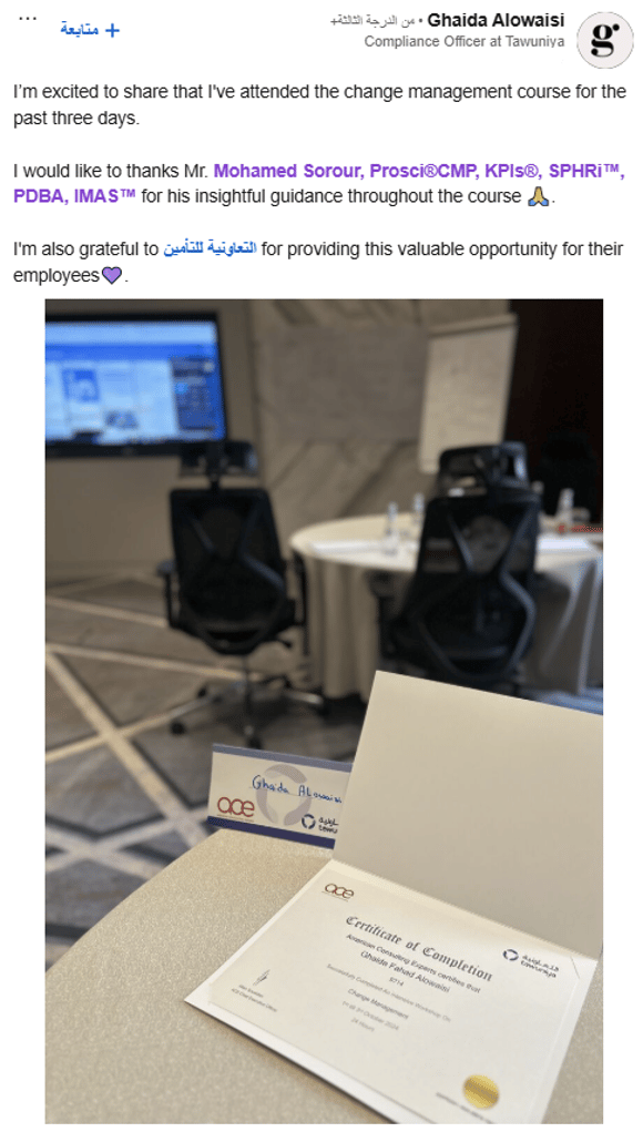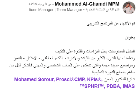 حاصل على شهادات مهنية معتمدة في إدارة التغيير والموارد البشرية، التخطيط الاستراتيجي، إدارة الأداء، الجودة، الحوكمة، المخاطر، والامتثال، وغيرها من المجالات ذات العلاقة.