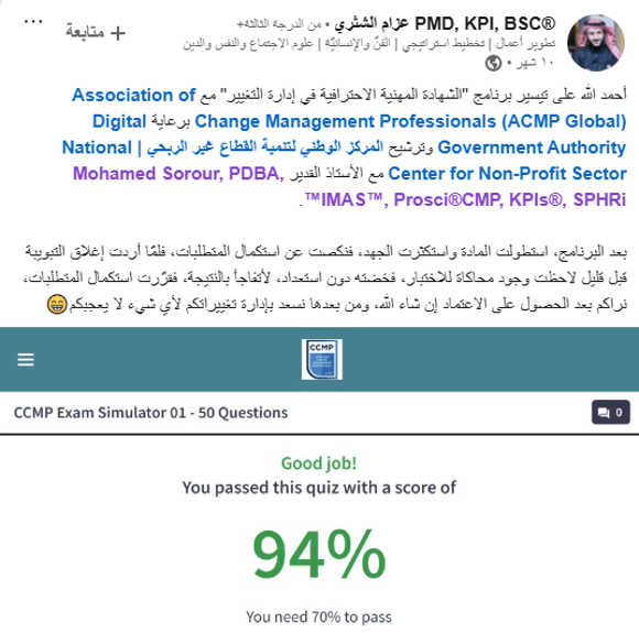 خبرة عملية في إدارة التغيير، مواءمة الاستراتيجية مع التحولات الجذرية، وإدارة الأداء والجودة.